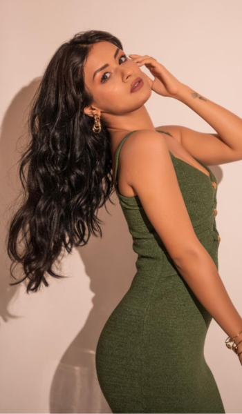 Avneet looks stunning in this black one-piece with a built-in gold accessory belt.