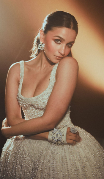 Our Desi Girl wore a strapless black Maison Valentino dress with a bow, thigh-high slit, white leather gloves, black faille cape, and Bulgari jewelry.