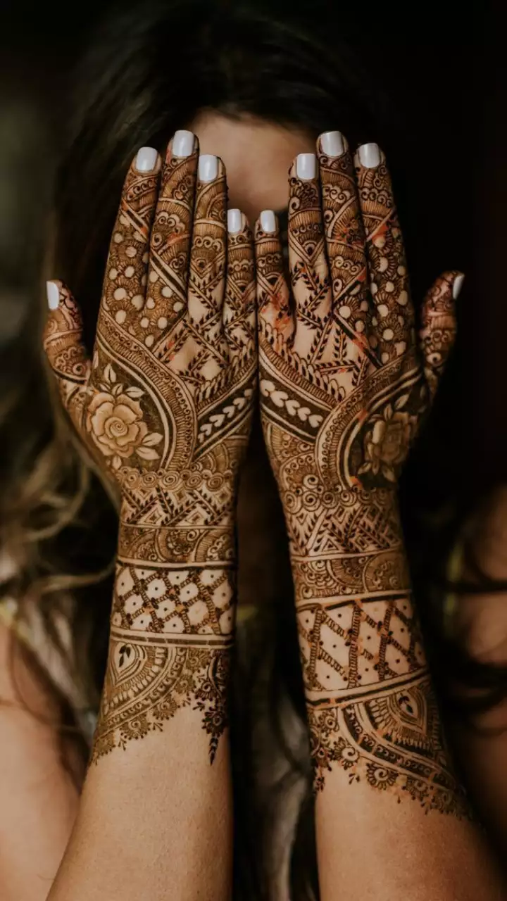 Mehndi for Karwa Chauth offers a traditional and unique twist to ethnic outfits, combining floral & geometric patterns for bold & gorgeous results.