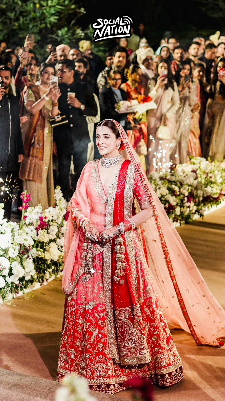 Nupur turned Manish Malhotra bride in a coral and peach dual-toned lehenga with dramatic pleats, ruffles, and a flowing train.