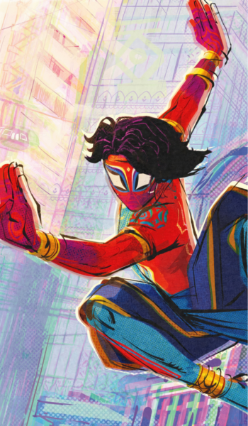 Pavitr, the defender of Earth-50101, resides in Mumbattan, a blend of Mumbai and Manhattan, and was raised by his Uncle Bhim and Aunt Maya.