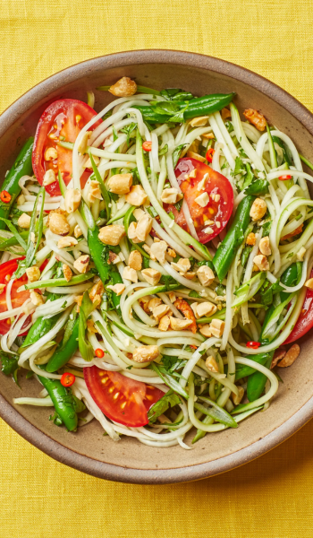 Grate raw papaya and toss with grated coconut, roasted peanuts, and lemon dressing.