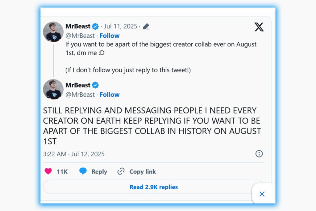 On July 11th, MrBeast lit up X (that’s what Twitter’s calling itself these days) with a post that made creators around the world stop dead in their content-creating tracks. The message couldn’t have been simpler or more universal: “If you want to be a part of the biggest creator collab ever on August 1st, DM me. If I don’t follow you, just reply to this tweet!” It’s open borders, open DMs, open arms and let’s be honest, open chaos (the fun kind) as thousands rush to get on board.